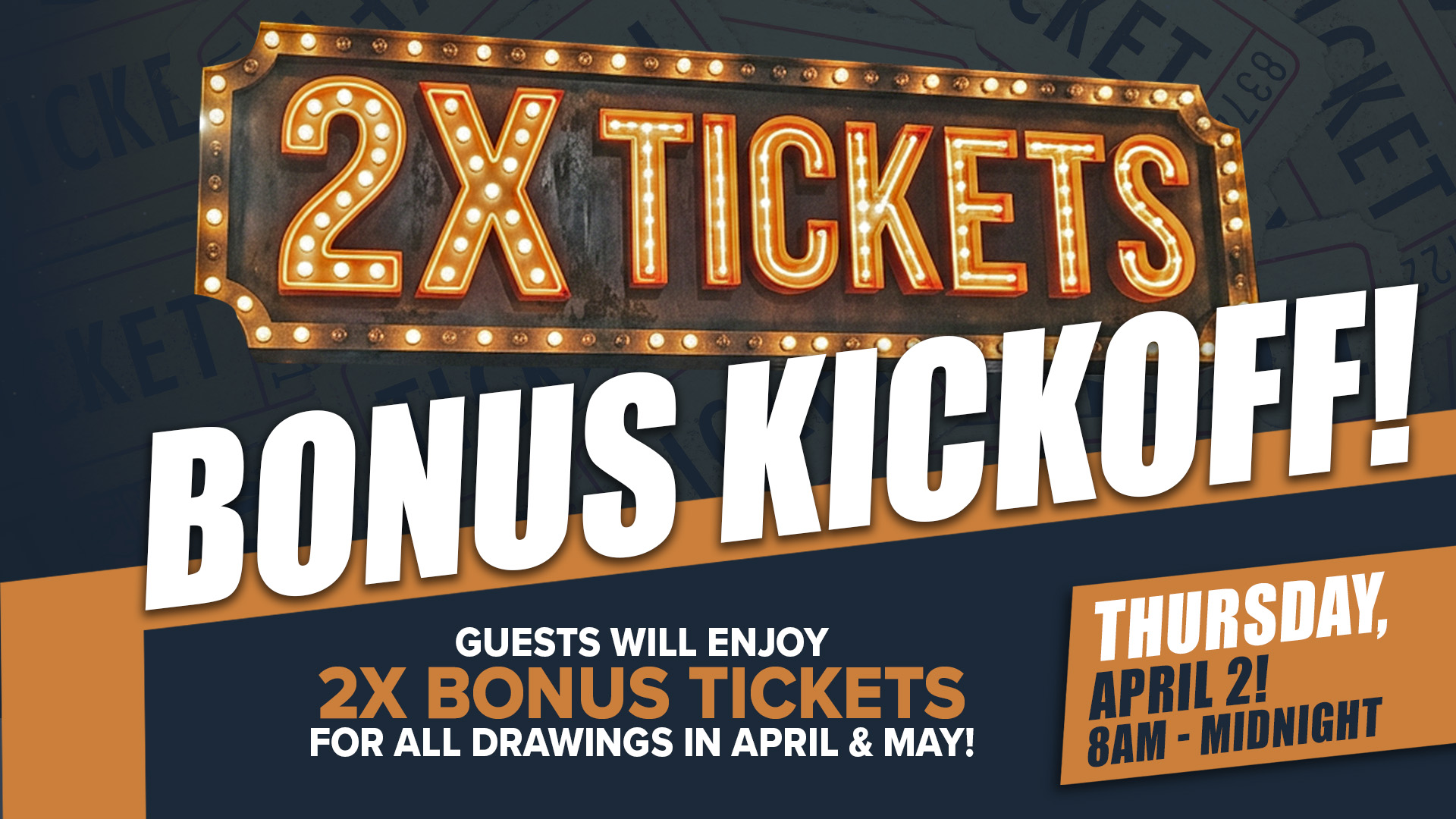 Guests will enjoy 2x bonus tickets for all drawings in april & may!