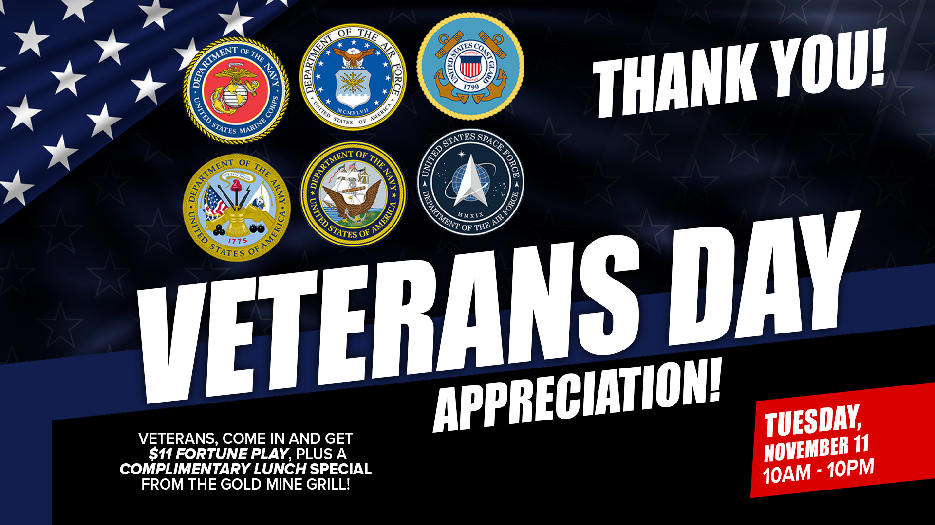 Veterans will receive $11 in fortune play & a complimentary lunch special from the Gold Mine Grill!